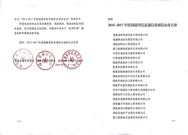 12月11日,福建省信息通信行業協會第四屆理事會第三次會議暨2015-2017年度福建省信息通信業誠信企業”表彰儀式在福州召開,福建訊網網絡科技股份有限公司(簡稱“訊網網絡”)繼榮獲“2012-2014年度福建省通信業誠信企業”后,再次榮獲此殊榮。