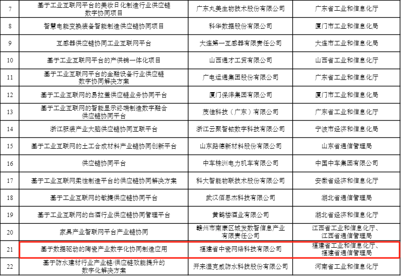 日前,工信部發布了2023年工業互聯網試點示范名單,愛陶瓷平臺(中瓷網絡)憑借“基于數據驅動的陶瓷產業數字化協同制造應用”成功入選工業互聯網平臺+產業鏈/供應鏈協同試點示范,祝賀!
