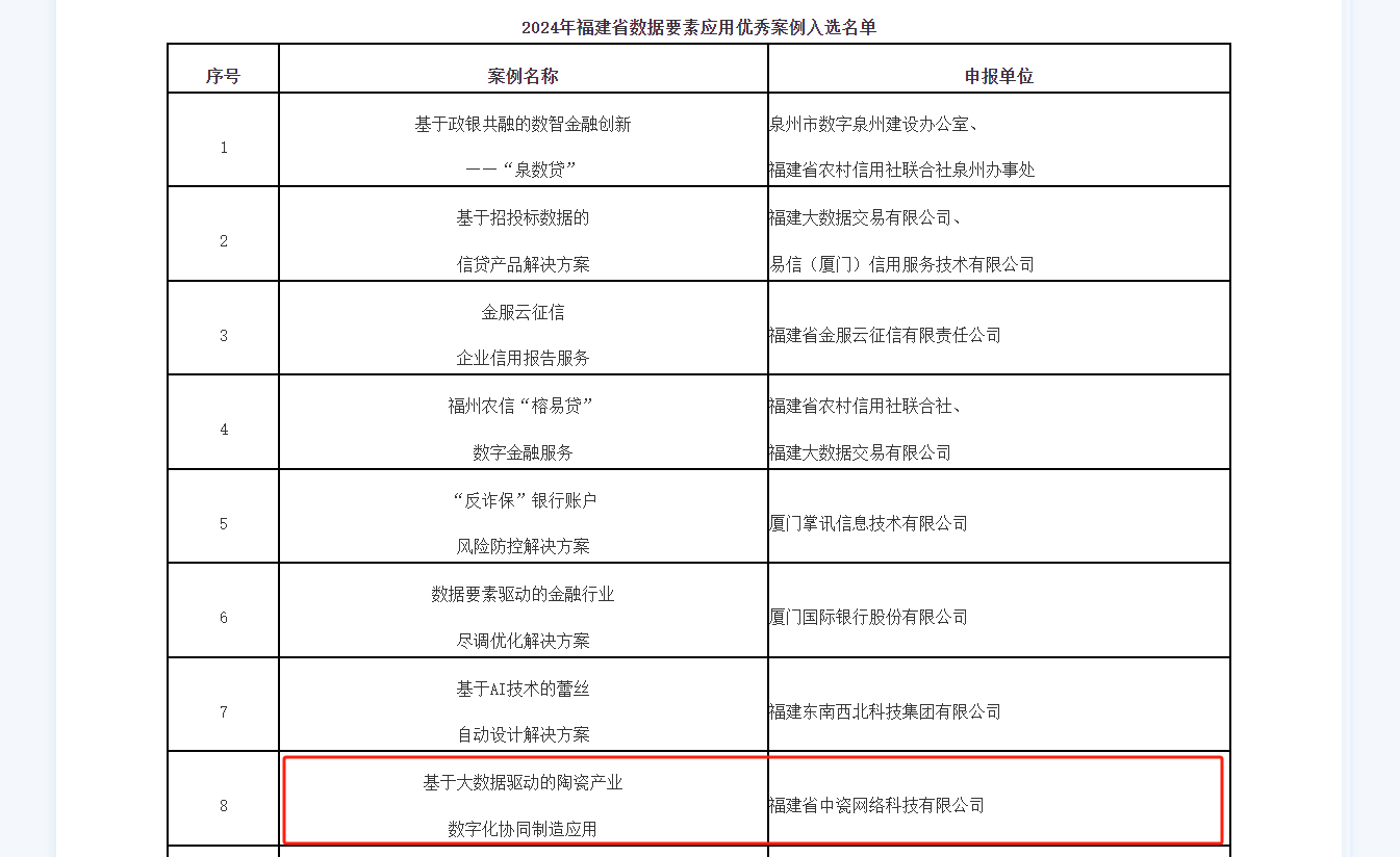 為深入貫徹《“數(shù)據(jù)要素×”三年行動計劃(2024—2026 年)》文件精神,充分發(fā)揮數(shù)據(jù)要素乘數(shù)效應(yīng),賦能經(jīng)濟社會發(fā)展,日前,福建省數(shù)據(jù)管理局發(fā)布了2024年數(shù)據(jù)要素應(yīng)用優(yōu)秀案例,中瓷網(wǎng)絡(luò)“基于大數(shù)據(jù)驅(qū)動的陶瓷產(chǎn)業(yè)數(shù)字化協(xié)同制造應(yīng)用”案例成功入選,泉州市唯一一家,祝賀!