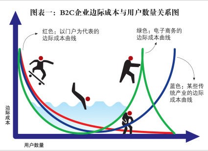 與門戶等互聯網產業一樣,B2C產業特征是典型的邊際成本先下降再上升,然后再下降的反微笑曲線(如下頁圖表所示)。無論是水漲船高的網絡推廣費用,抑或是讓各家B2C企業坐如針氈、日益高昂的客戶獲取成本,B2C企業之爭已經從原有的“野蠻式生長”的陣地戰,過渡到了今日的“搶人戰”。